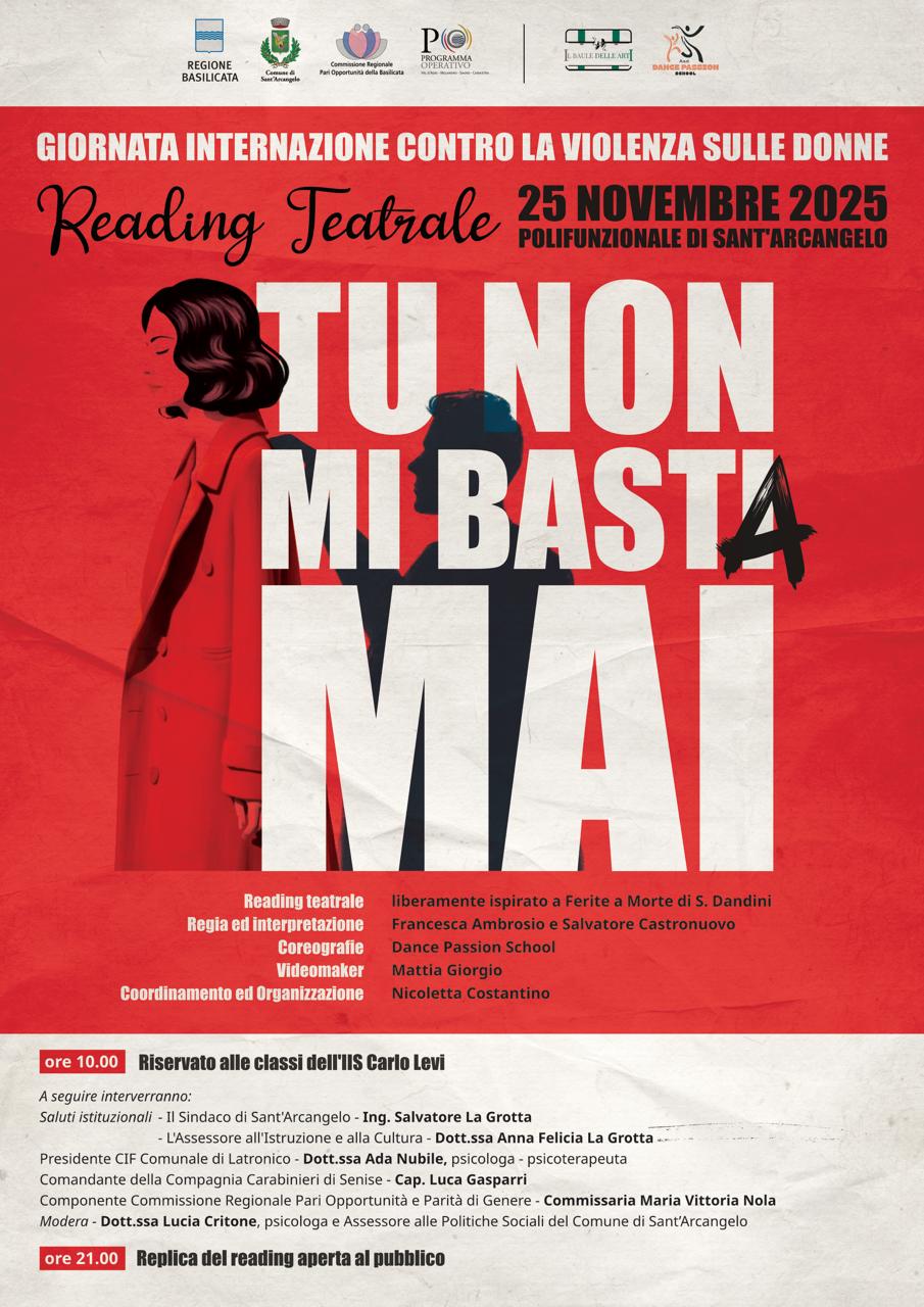 Il Comune di Sant’Arcangelo rende noto che, in occasione della Giornata Internazionale contro la Violenza sulle Donne, insieme alla Regione Basilicata, alla Commissione Regionale Pari Opportunità e al Programma Operativo Regionale, promuove il reading teatrale “Tu non mi basta mai”, liberamente ispirato a Ferite a Morte di Serena Dandini.