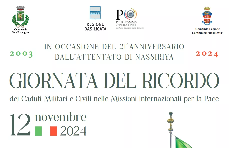 Pubblicata il - 07/11/2024 Ricordo dei Caduti: 21° Anniversario Attentato di Nassiriya Il 12 novembre 2024, a Sant'Arcangelo (PZ), si celebra il 21° anniversario dell'attentato di Nassiriya con messa, corteo e concerto della Fanfara del 10° Reggimento Carabinieri. Ingresso libero.